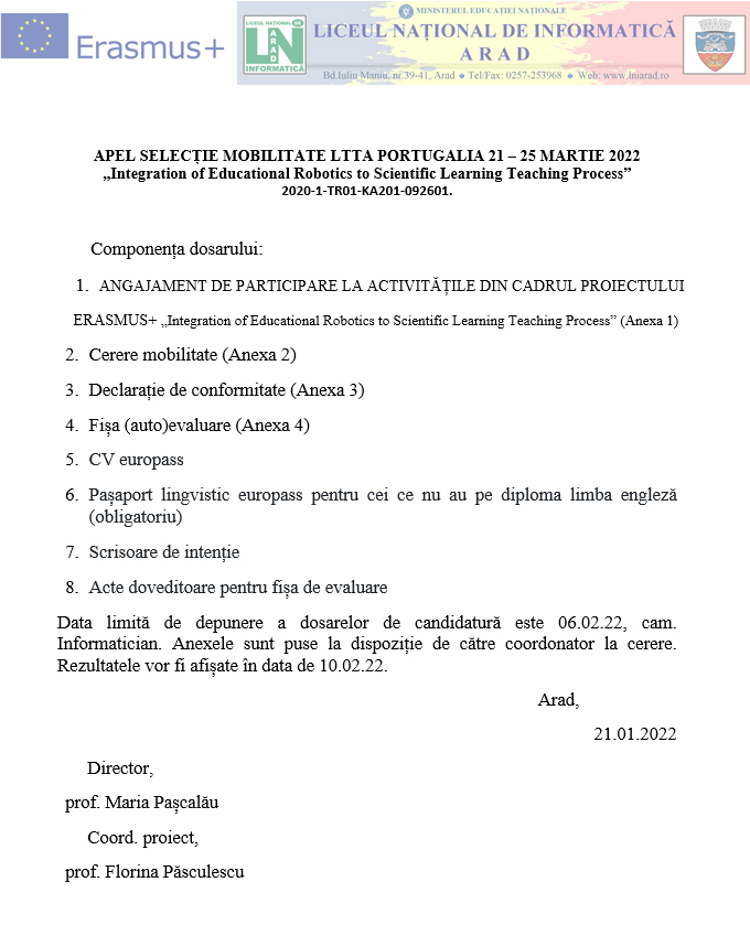 Liceul Național de Informatică Arad, în calitate de partener al proiectului ”Integration of Educational Robotics to Scientific Learning Teaching Process” (nr. proiect 2020-1-TR01-KA201-092601), finanțat prin programul Erasmus+, a organizat în data de 9 decembrie 2022, evenimentul de multiplicare (workshop), activitate de diseminare a activităților implementate și a produselor intelectuale elaborate în cadrul proiectului, în perioada 2020-2022.